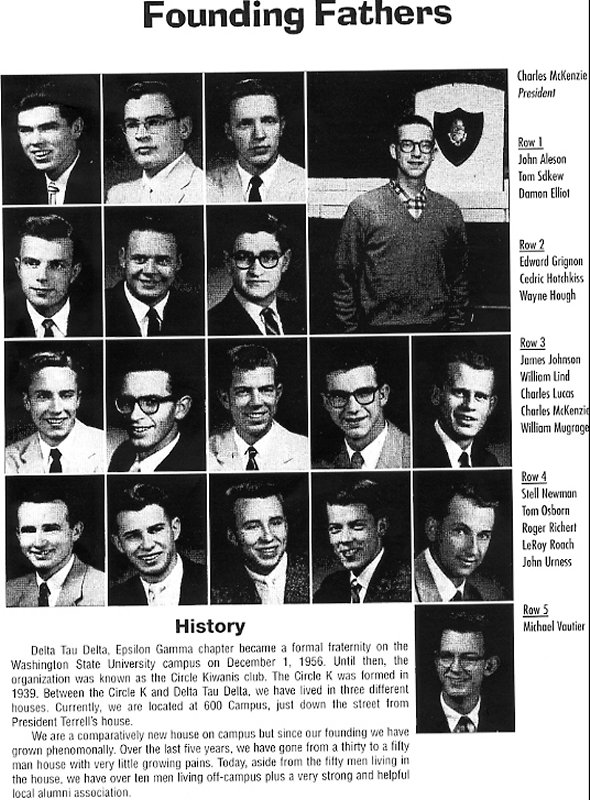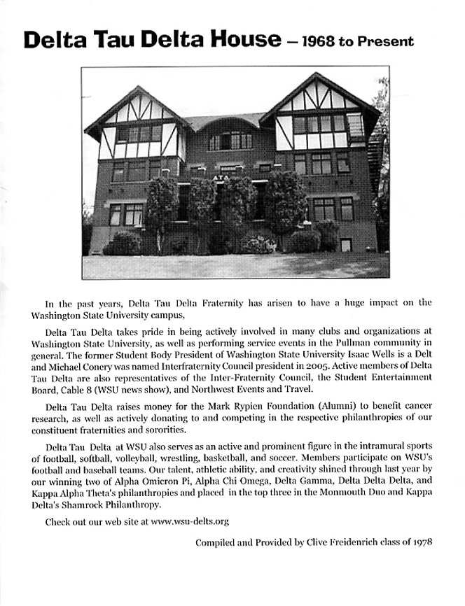 Clive Freidenrich (' 78) prepared a 4-page brochure on the history of Epsilon Gamma chapter of Delta Tau Delta for the 50th Anniversary ceremony. Click the links below to see the brochure: Brochure - Page 1 | Brochure - Page 2 | Brochure - Page 3 | Brochure - Page 4 50th Anniversary Ceremony - Quality Inn, Pullman ![]() Dave Hawthorne ('79) on the left and Steve Tytler ('78) ![]() Tom Addison ('78) in the center, Mrs. Chris Addison and Jim Cornwall ('78) ![]() ![]() ![]() 2006 Delta Tau Delta Chapter President Matt Loveless addresses the group. ![]() Clive Freindenrich ('78) presents an award to current Delt Joe Wyatt for organizing the 50th Anniversary event. ![]() ![]() Former WSU Quarterback & 1992 Superbowl MVP Mark Rypien (Delt Class of '86), wearing red cap. Chapter Advisor Alan Martinson (Delt Class of '83), near the door, wearing gray shirt with crimson collar. ![]() ![]() Pullman Mayor (and WSU stadium announcer) Glenn Johnson entertains the group with some jokes about WSU fraternities in the "old days," the USC band's "four note song" and his problems with the USC football team: They object to him saying: "And that's ANOTHER ... COUGAR ... FIRST DOWN!" ![]() ![]() ![]() Delta Tau Delta International President Rock Clinton congratulates Epsilon Gamma chapter for its 50th anniversary. ![]() Rock Clinton introduces the following members (from left to right): Current Chapter President Matt Loveless, Roger Richert and Charles McKenzie -- two original founding members of Epsilon Gamma chapter in 1956. ![]() Dave Hawthorne receives an award from Delta Tau Delta International for his 25 years of service as head of the house corporation. ![]() Multi-generational group shot after the ceremony. Front Row L-R: Founding Member Charles McKenzie, Clive Freindenrich (' 78), Founding Member Roger Richert, Steve Tytler (' 78). Back Row L-R: Dave Hawthorne (' 79), Jeff Shreves (' 78), Mark Rypien (' 86), Matt Loveless (' 07) Barbecue at the Delt House after the Ceremony ![]() ![]() ![]() ![]() ![]() ![]() ![]() ![]() ![]() Group shot in the chapter room. L-R: Jim Cornwall, Clive Freindenrich, Tom Addison, Steve Tytler (all Class of '78) and Art Jonson ('79) WSU-USC football game. We almost won! Final score: 28-22 ![]() ![]() ![]() ![]() ![]() Front Row, L-R: Nancy Tytler, Julie Jonson and Harry Schaler (Delt Class of '64) Back Row, L-R: Chris Addison, Tom Addison, Art Jonson and Steve Tytler |