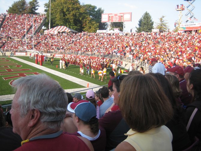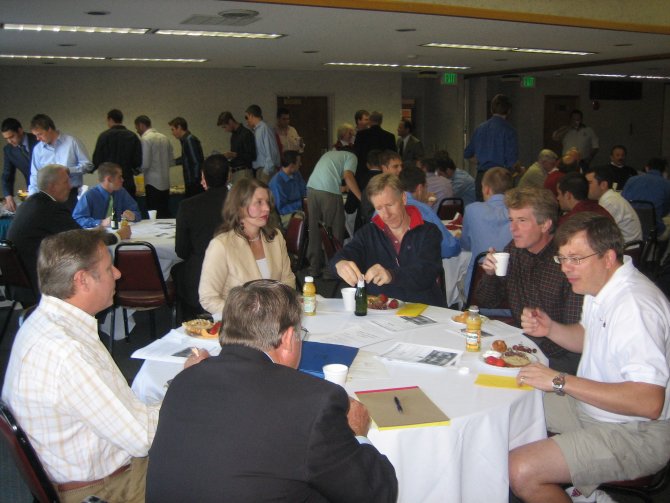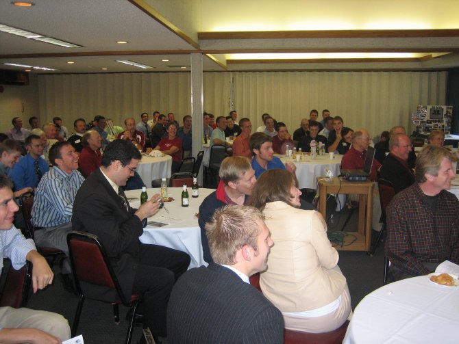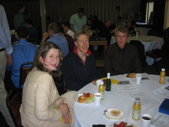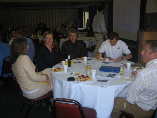 ![]() Pullman Mayor (and WSU stadium announcer) Glenn Johnson entertains the group with some jokes about WSU fraternities in the "old days," the USC band's "four note song" and his problems with the USC football team: They object to him saying: "And that's ANOTHER ... COUGAR ... FIRST DOWN!"