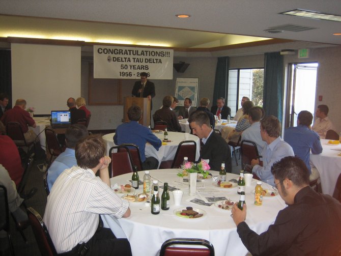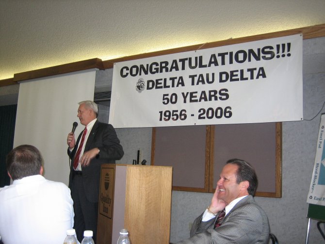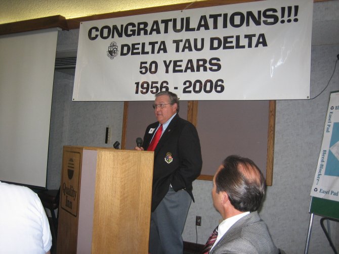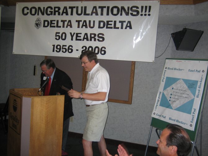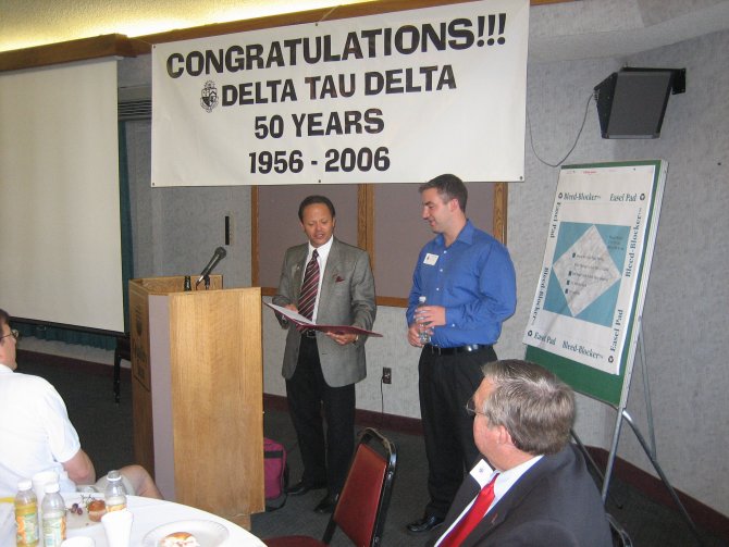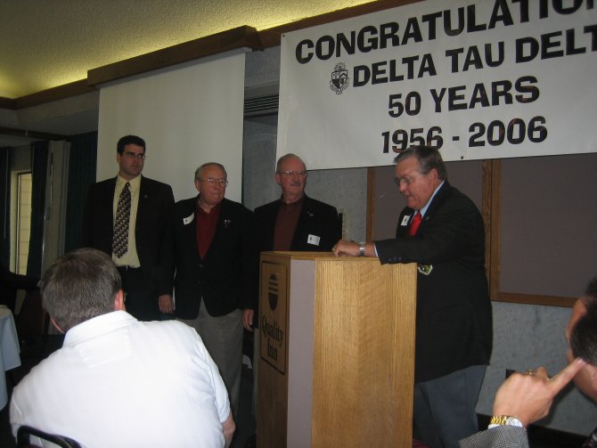 ![]() 2006 Delta Tau Delta Chapter President Matt Loveless addresses the group. ![]() Clive Freindenrich ('78) presents an award to current Delt Joe Wyatt for organizing the 50th Anniversary event.
