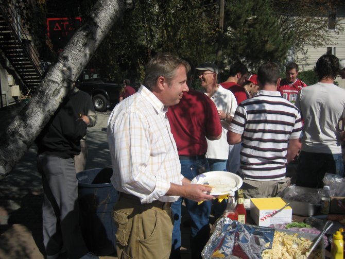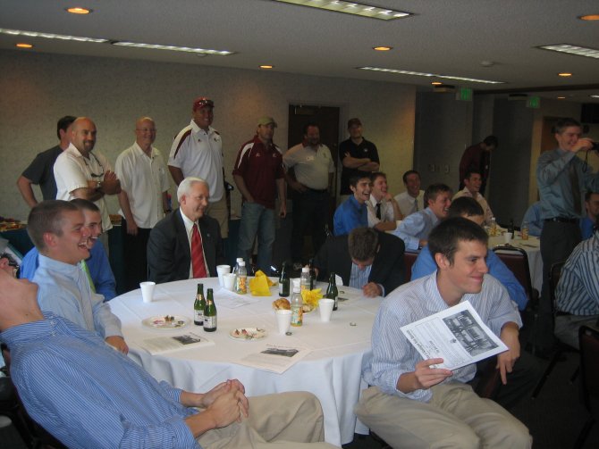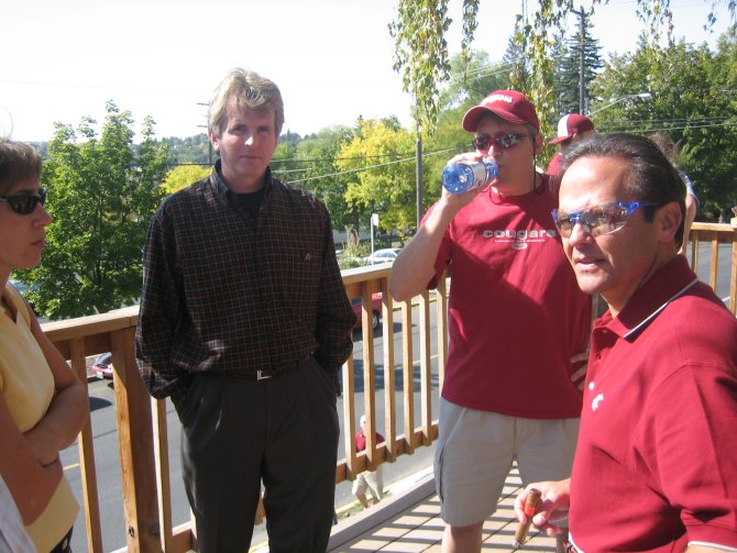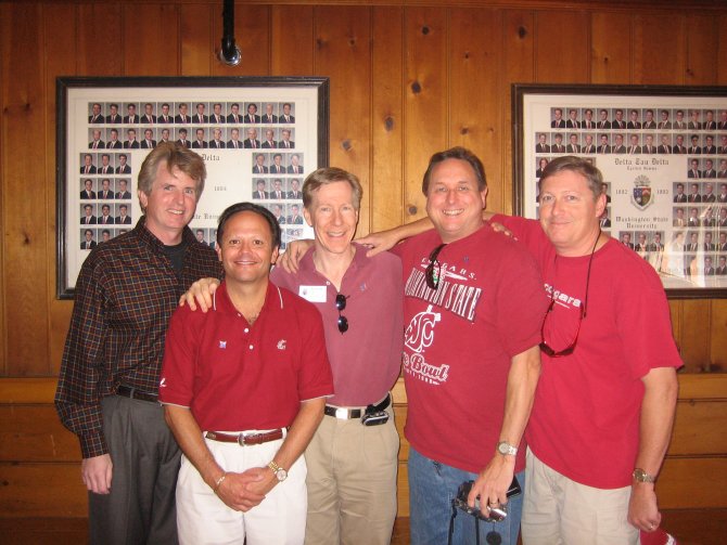 ![]() Former WSU Quarterback & 1992 Superbowl MVP Mark Rypien (Delt Class of '86), wearing red cap. Chapter Advisor Alan Martinson (Delt Class of '83), near the door, wearing gray shirt with crimson collar.