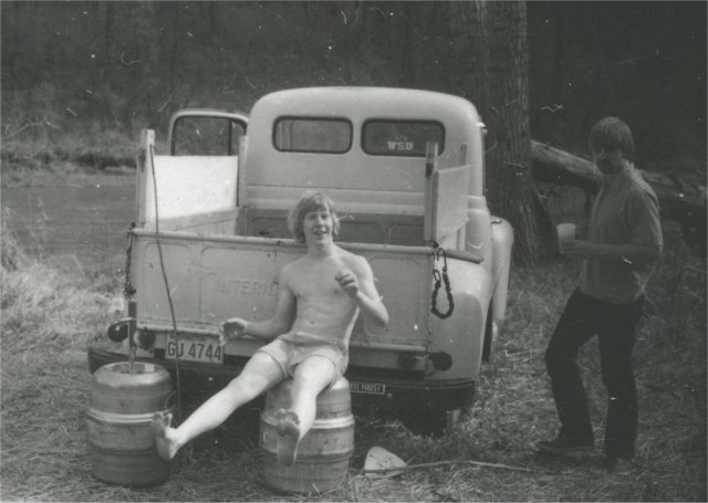 We drove the old Nash hearse, several cars and two kegs of beer out to Eden Valley for the annual "8th of May" kegger. Those of you familiar with the WSU "8th of May" tradition may wonder why a bunch of guys would drive out into the woods to drink beer by themselves. And looking back on it now, you're absolutely right, it makes NO sense at all! But what the hell, we had fun any way.