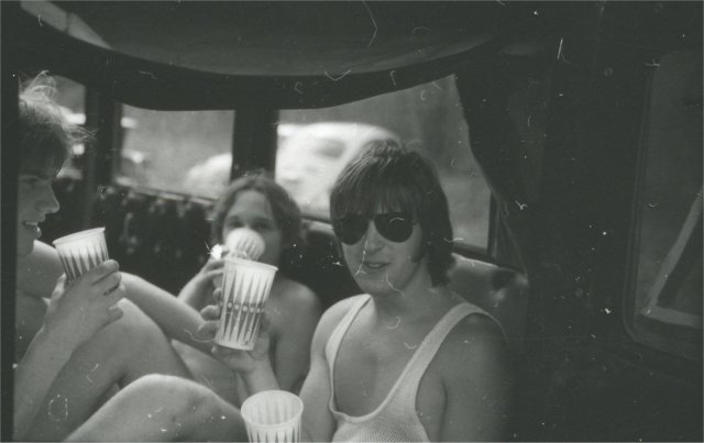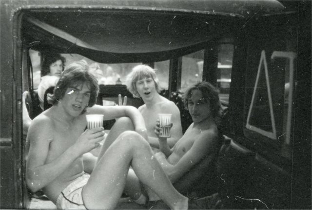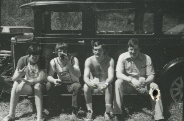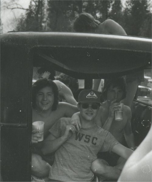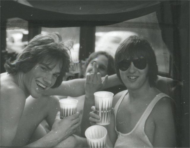 Rich Dunham (in driver's seat) and (left to right) John "John Boy" Harris, Tom "TA" Addison and Steve Tytler drinking beer in the back of the hearse. All Class of '78.