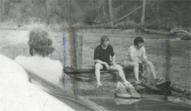 Gary Sperline, ' 76 (back to camera) leans against his '57 Chevy while Bruce Lucas, ' 75 (left) and Phil Campbell, ' 76 (right) kick back on a log by the river.