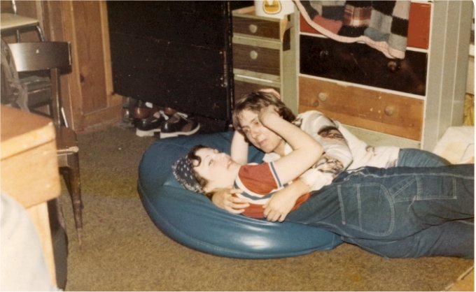 Ingersoll and Spillers sitting on the lap of "Santa Graz" (Don Grazzini Class of '76)