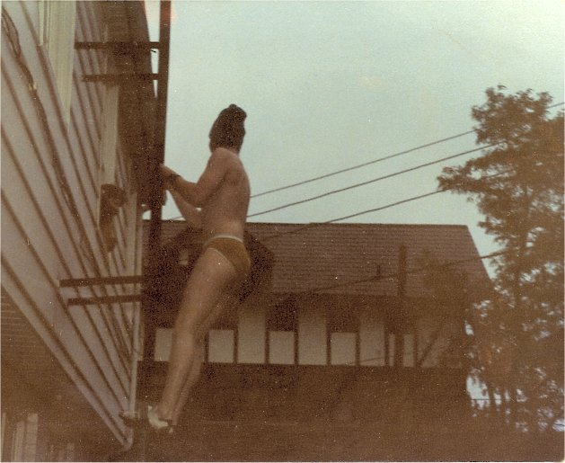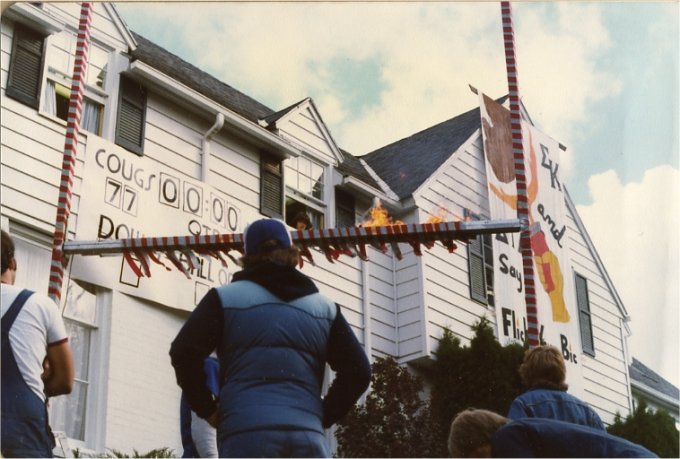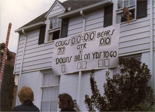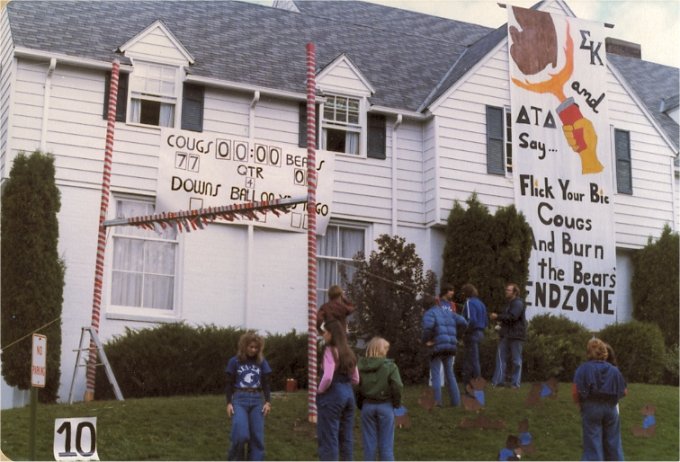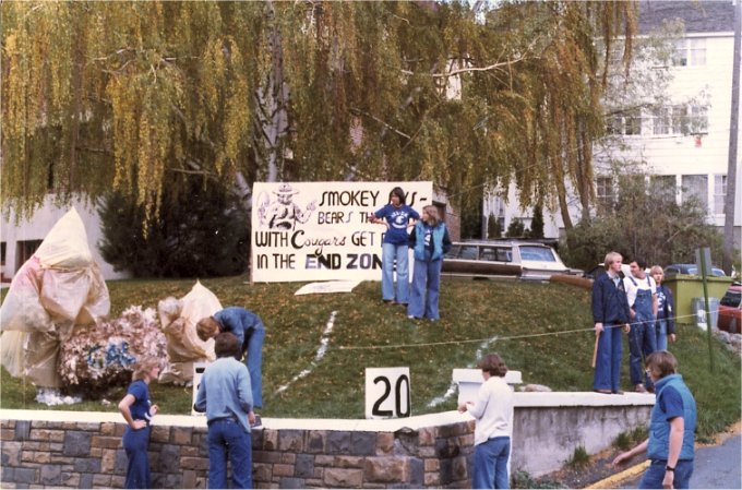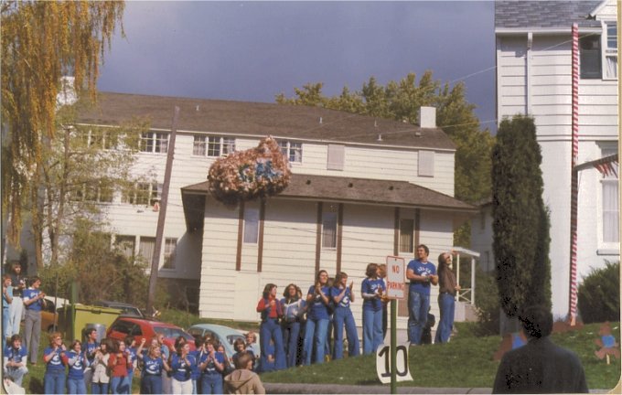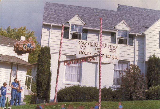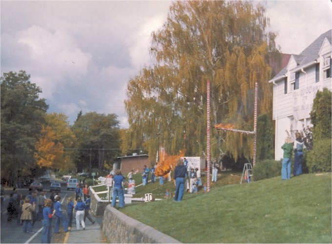 This is the rest of the display on the SK front yard. You can see the finished goal post and a big sign on the side of the SK house explaining the theme of the display. Notice the little bears on the ground. Doug Weiland (' 78) is holding the end of the rope that will be used to pull the bear from the DTD yard through the goal posts.